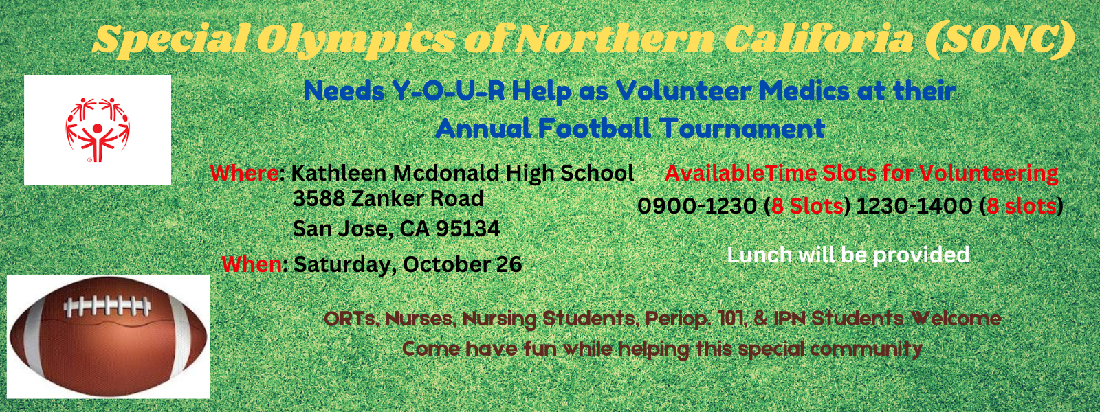 The Special Olympics athletes are having a tournament on October 26th and need our generous volunteers to help provide first aid services while cheering them on!